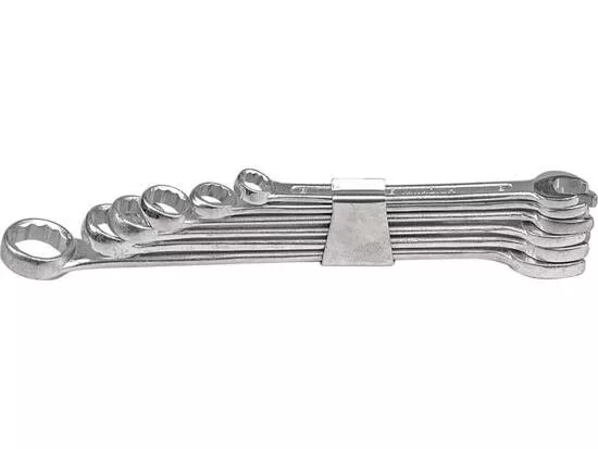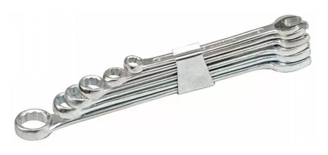 Kétoldalas szénacélból készült csillag-villáskulcs készlet 15 részes. A kulcsfejek 15 fokban ferdén állnak