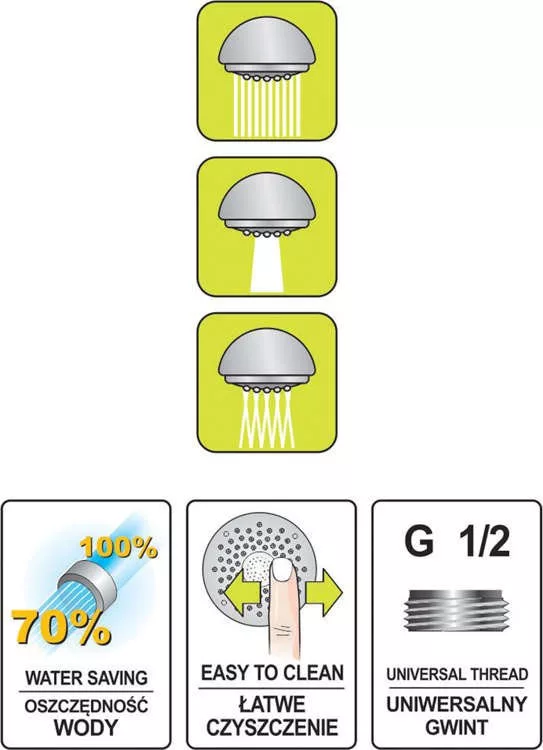Zuhanyfej 3 funkciós, beépített vízszabályzóval, tartós és könnyű ABS anyagból.