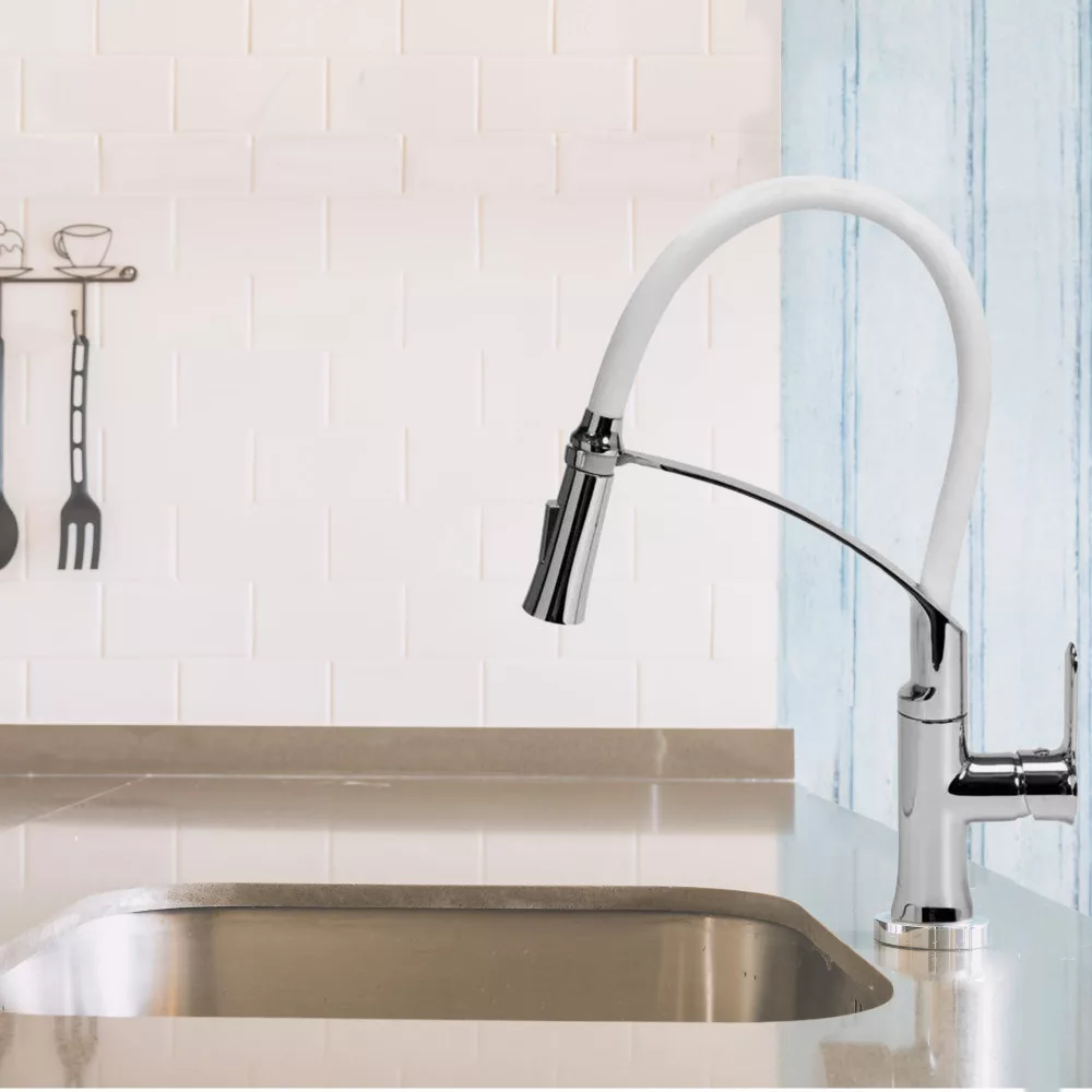 Mosogató csaptelep fehér flexibilis csővel, gyémánt keménységű kerámia betéttel, 360 fokban elforgatható 60 cm hosszú kifolyóval.
