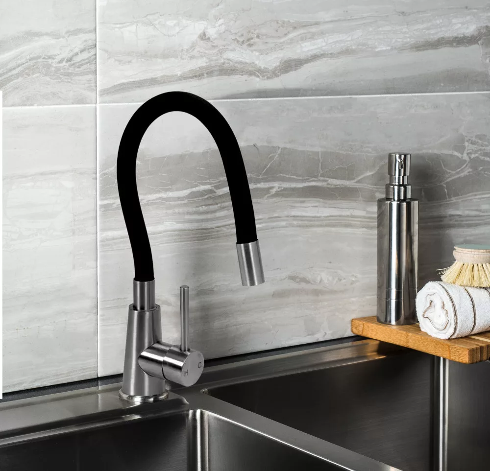 Mosogató csaptelep flexibilis csővel, ergonomikus kialakítású fogantyúval, színes szilikonnal borított kifolyóval.