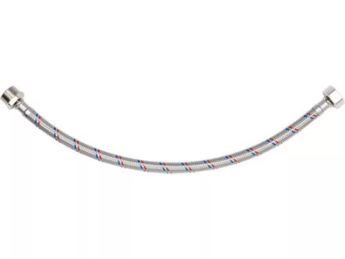 Flexibilis bekötőcső 1/2 col x 1/2 col (belső-külső) 40 cm-es, rozsdamentes acél, hideg és meleg vízhez készült, Országos Higiéniai Intézet tanúsította.