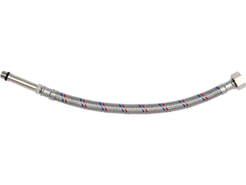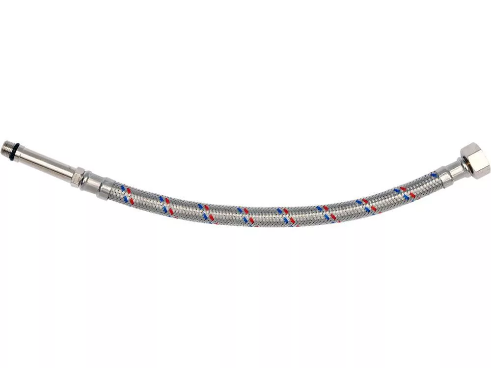 Flexibilis bekötőcső 3/8 col x M 10 (belső-külső) 30 cm-es, rozsdamentes acél, hideg és meleg vízhez készült, Országos Higiéniai Intézet tanúsította.