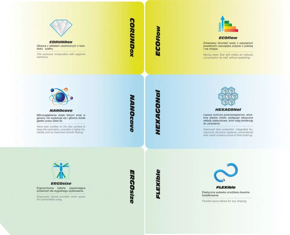 Fej zafír keménységű kerámia betéttel van felszerelve, mikroszkopikus mélyedésekkel a felületén, amely megvédi a kenőanyagot a kimosódástól és hosszú évekig garantálja a csaptelep problémamentes működését