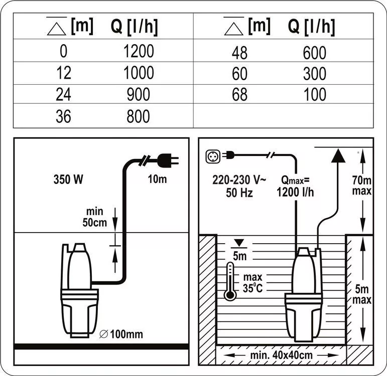 Elektromos búvárszivattyú 350 W teljesítmény, tiszta víz szivattyúzására kutakból, kerti tavakból, valamint telkek öntözésére.