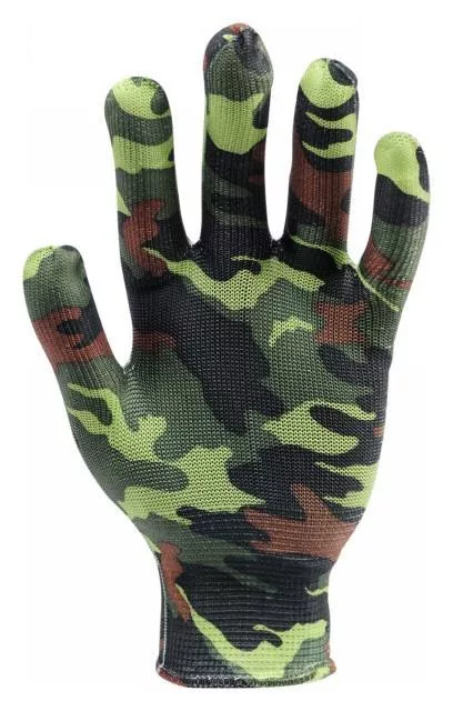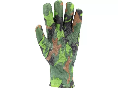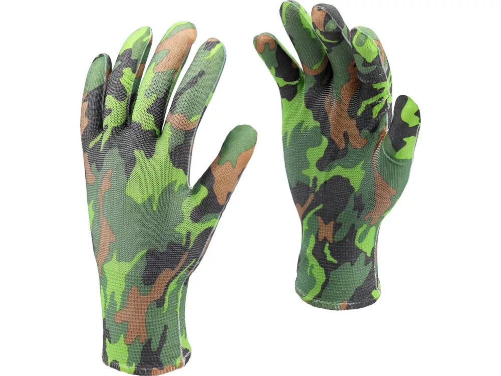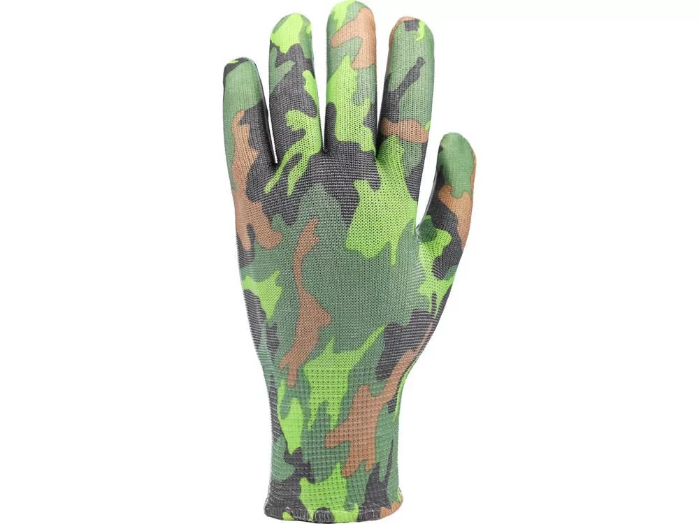 Könnyű kerti kesztyű terepszínű poliészterből.