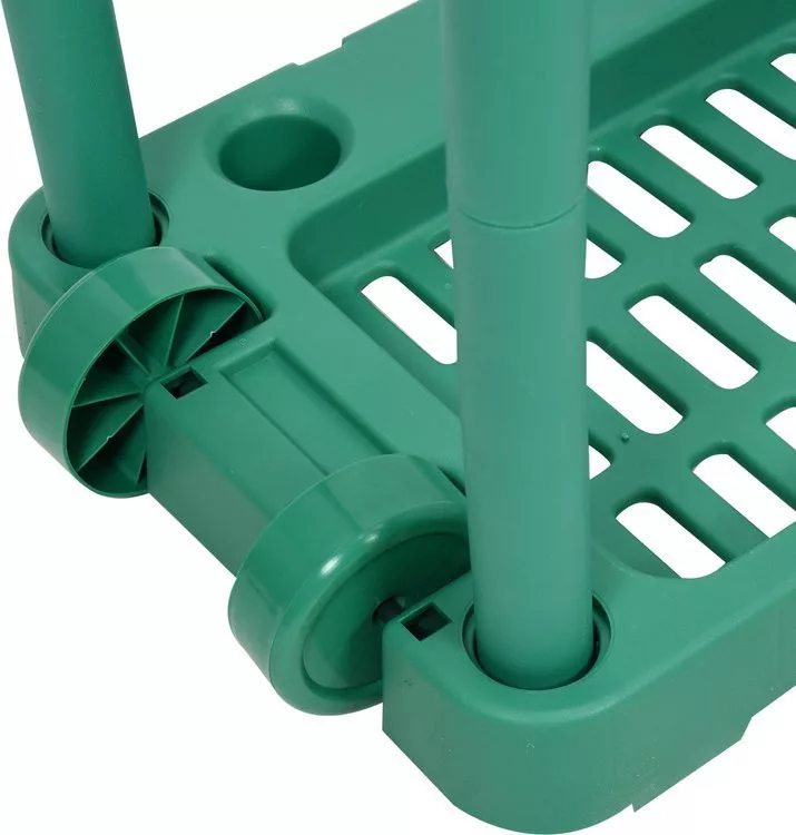 Kerti szerszám tároló, két kerékkel rendelkezik, amelyek segítségével könnyen mozgatható.