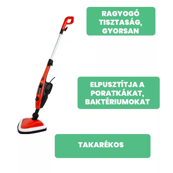 Gőzfelmosó, 1500W teljesítményű, forgó felmosófej, kényelmes fogantyúval.