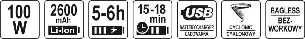 Zsák nélküli porszívó 100 W-os teljesítményű és 3 kPa-s porszívóval. A mellékelt tartozékok lehetővé teszik az autó átfogó tisztítását, beleértve a nehezen hozzáférhető területeket és sarkokat is.
