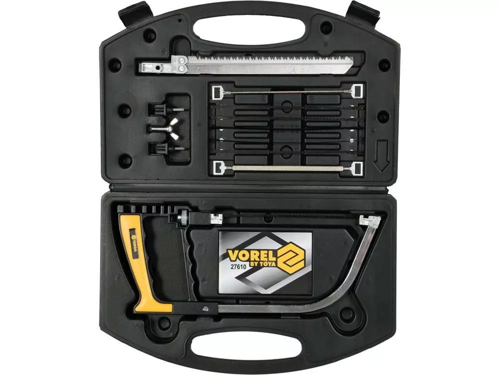 A készlet tartalma: Keret kerek üvegvágóval és bevágásokkal üveg vagy kerámia töréséhez, többcélú fűrészlap x6 (fához, fémhez és műanyaghoz), gyémánt fűrészlap x2 (lapos, kerek), fűrészlap.