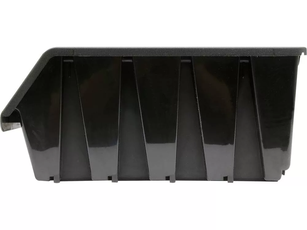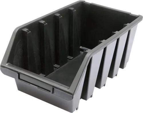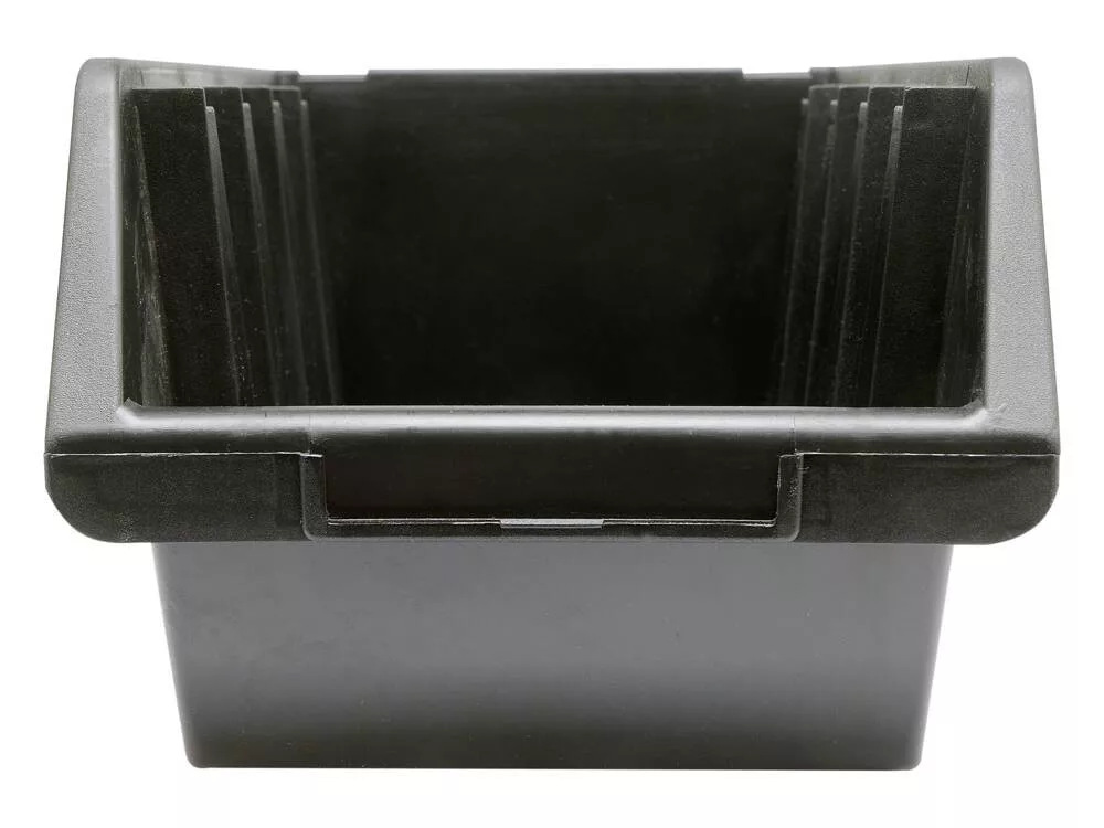 Fekete színű műanyagból készült csavartartó. A tároló egymásra helyezhető és szerszámtáblákkal használható.