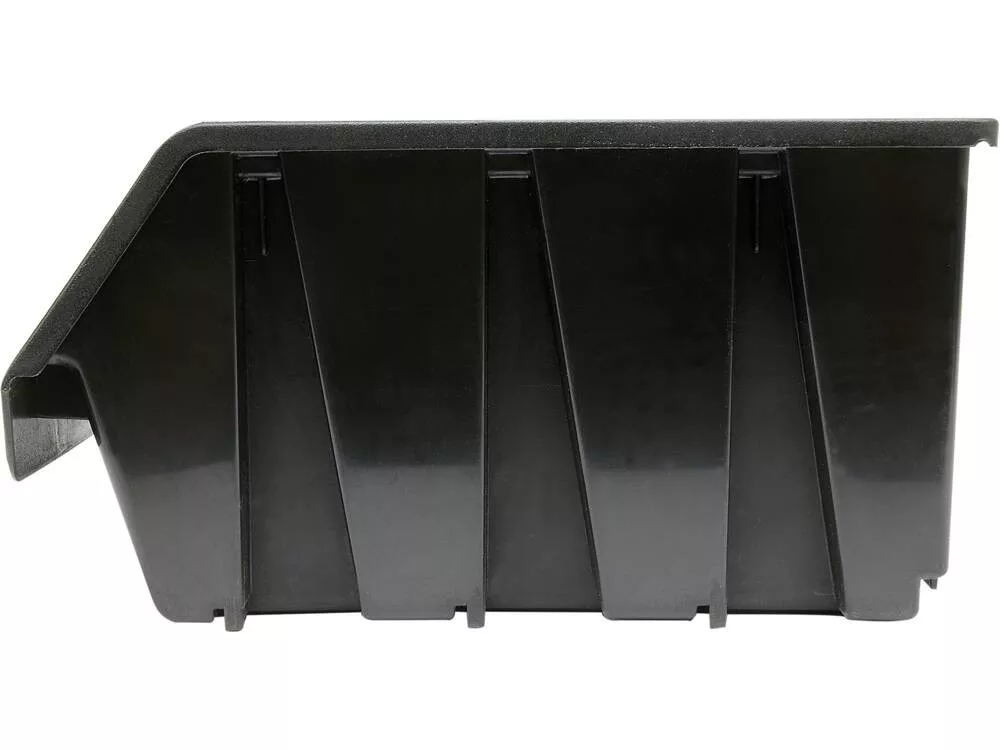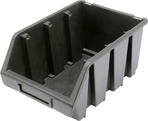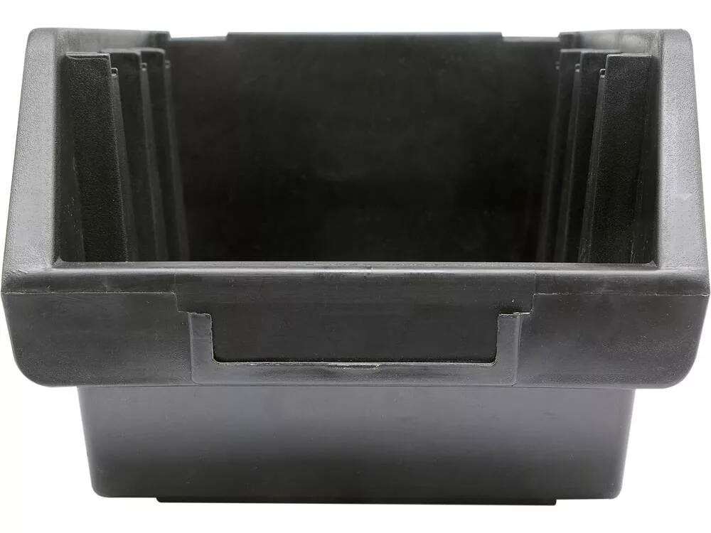 Fekete színű műanyagból készült csavartartó. A tároló egymásra helyezhető és szerszámtáblákkal használható.