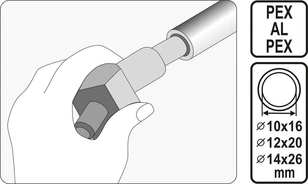 A kalibrátor nagyon hasznos a PEX-AL-PEX csövekkel végzett bármilyen munka során. Az alábbo átmérőjű csövekhez tervezve: Ø10x16 mm. Ø12x20 mm, Ø14x26 mm
