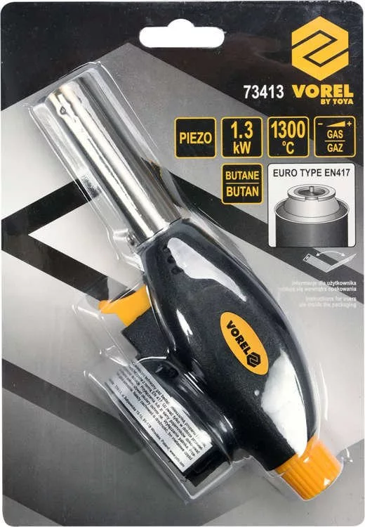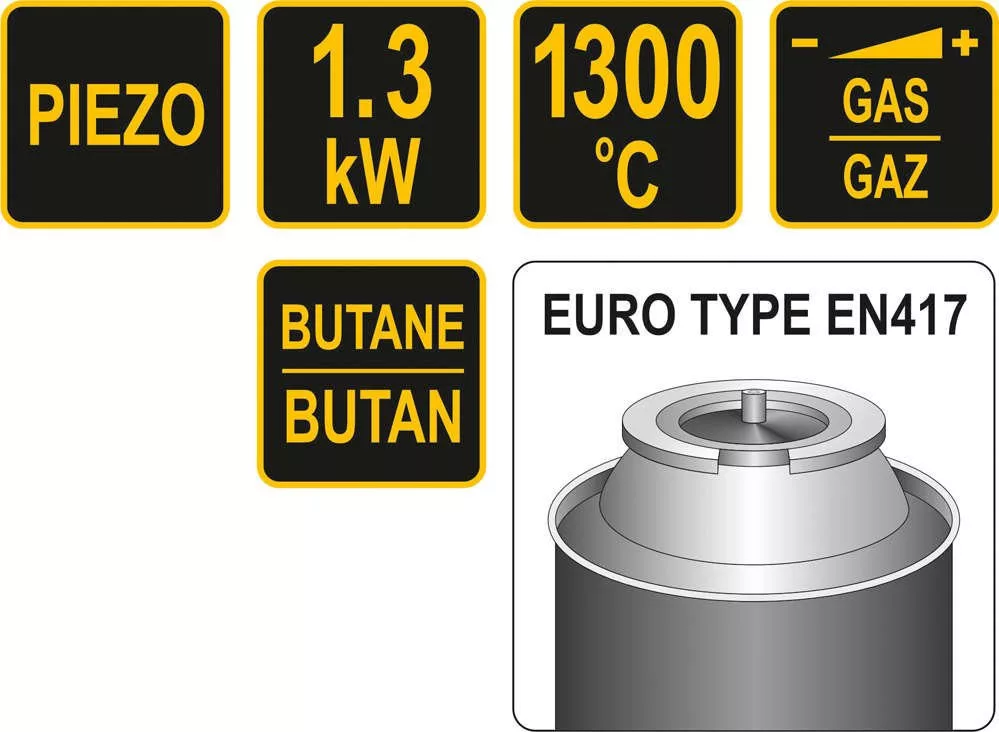 Gázégő PIEZO gyújtással. Külső palackból származó butángázzal működik - az EN417 szabványnak megfelelően. Palackcsatlakozás TWIST típusú égőhöz. Az égő teljesítménye 1,3 kW, és 1300°C hőmérséklet elérésére képes.