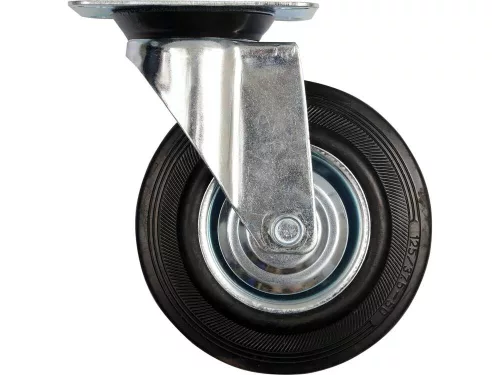 Önbeálló rögzítéssel, csapágyazva, fekete gumiabroncs, teljes magasság 130 mm. 100 mm átmérőjű kerék önbeálló szerelvénnyel, csapágyazással, fekete gumiabronccsal