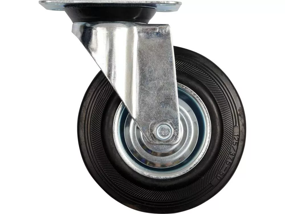 Önbeálló rögzítéssel, csapágyazva, fekete gumiabroncs, teljes magasság 155 mm. 125 mm átmérőjű kerék önbeálló szerelvénnyel, csapágyazással, fekete gumiabronccsal