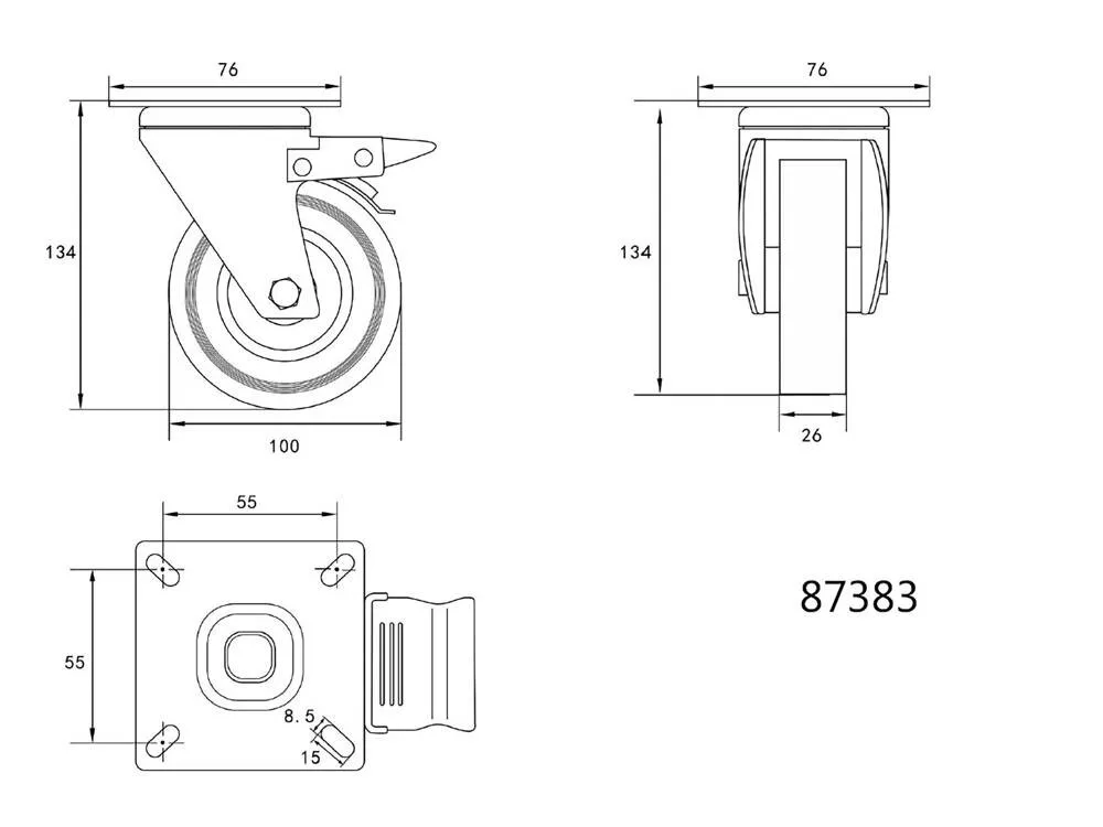 100 mm átmérőjű önbeálló kerék, csapágyazott, szürke gumiabroncs, magasság 134 mm