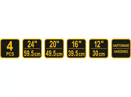 Négy darab edzett acél karból álló készlet. Hasznos a gumiabroncsok felszereléséhez és leszereléséhez. A készlet a következő karhosszúságokból áll: 30 cm, 39,5 cm, 49,5 cm, 59,5 cm