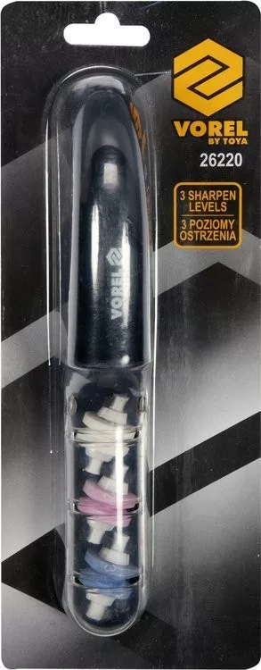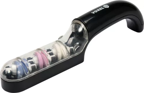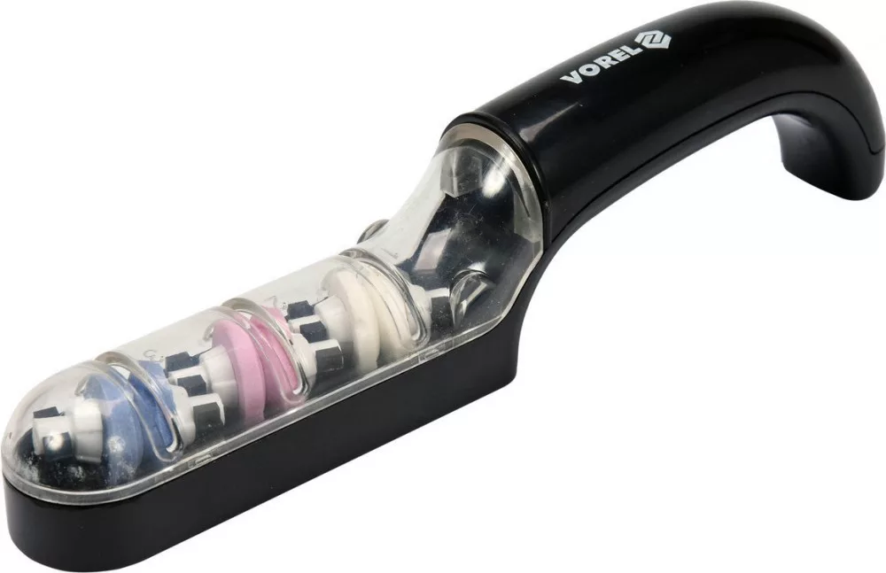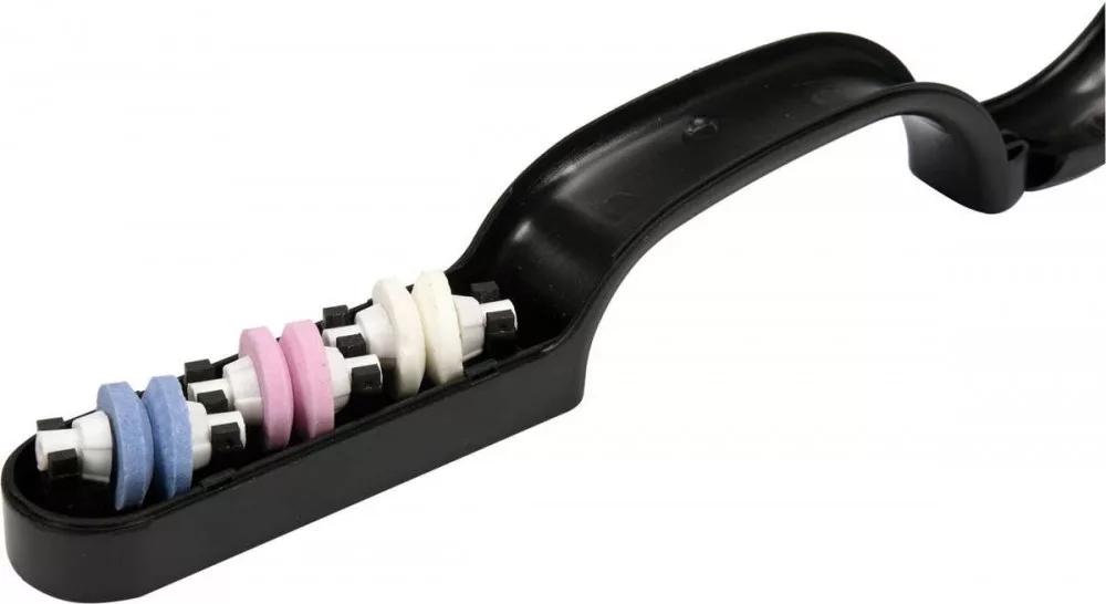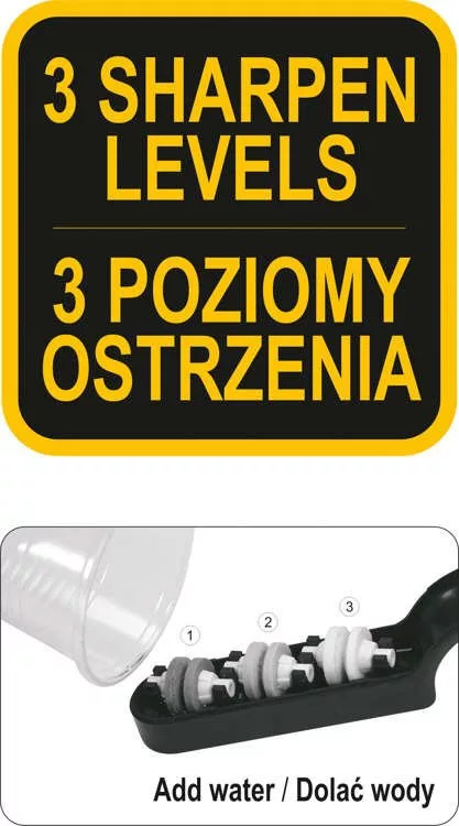 Három különböző keménységű dupla tárcsával ellátott élező. A test sérülésálló műanyagból készült, és víztartályként is funkcionál. A csiszolókorongok "nedvesen" működnek az élezés hatékonyságának növelése érdekében