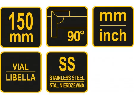 150 mm-es derékszög rozsdamentes acélból és alumíniumból vízmértékkel ellátva