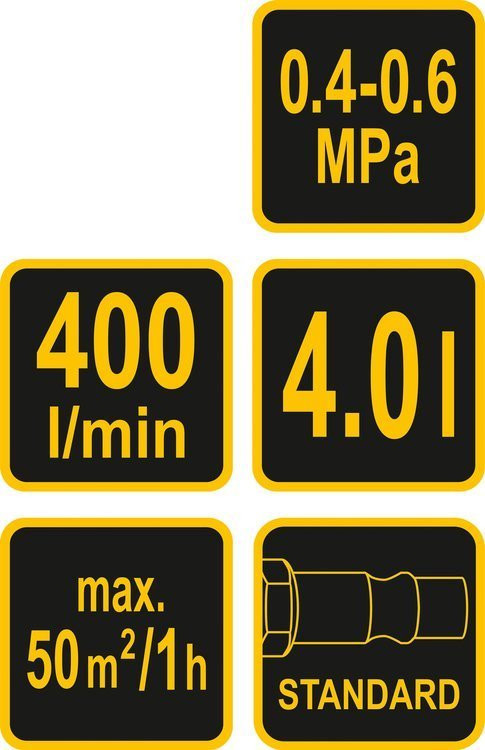 Rozsdamentes acélból és minőségi műanyagból készült pneumatikus vakológép sárgaréz szeleppel és levegőcsatlakozókkal. Használat módja: csatlakoztassa az eszközet a pneumatikus tömlővel a kompresszorhoz, adagolja a megfelelő mennyiségű habarcsot/gipszet a tartályba, irányítsa a lyukakat a vakolandó fal felé, nyissa ki a szívószelepet. Szükség szerint egyenletesen permetezzen. Ha végzett, merítse vízbe a vakolótartályt, és öblítse ki. Szükséges légáram: 350-400 l/min Ajánlott üzemi nyomás: 0,4-0,6 MPa Max. üzemi nyomás: 0,6 MPa Űrtartalom: 50 m²/óra Tartály űrtartalma: 4 l Méretek: 895x218x220 mm Fúvókák száma: 4 Fúvóka átmérő: 18 mm A levegőellátó tömlő belső átmérője: 10-14 mm Fogantyú hossza: 700 mm Levegőcsatlakozás átmérője (PT): szabványos Max. szemcseátmérő: 6 mm Hangnyomás: 94,9 ± 2,5 dB(A) Max zajszint: 105,9 ± 2,5 dB(A) Rezgés: < 2,5 m/s² Súly: 2 kg