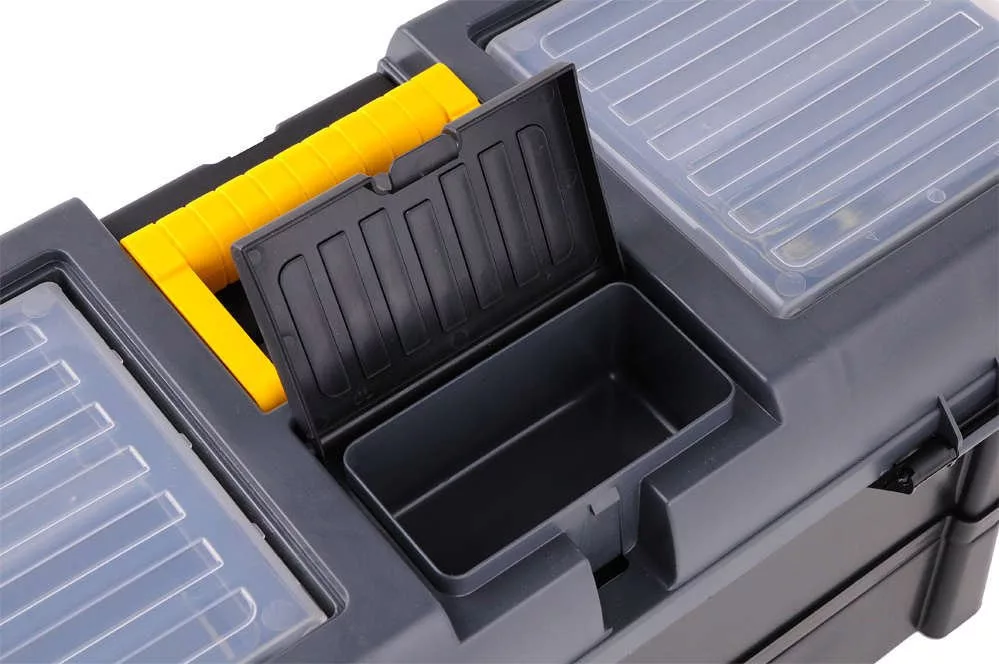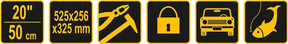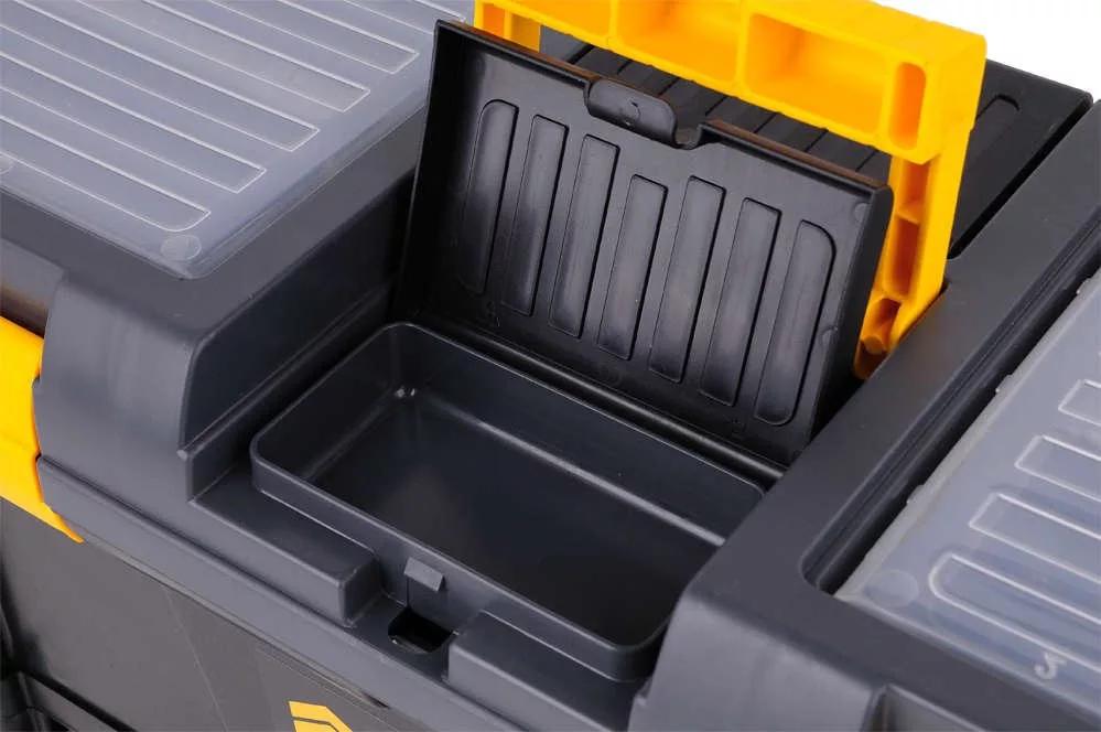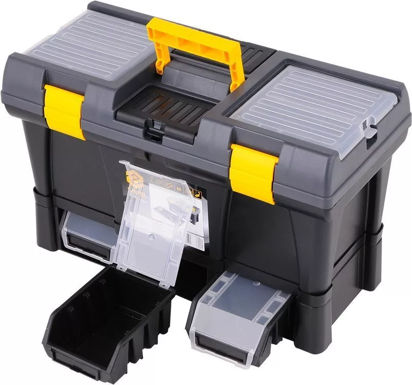 525x256x325 mm-es szerszámosláda 3 tárolórekesszel ellátott modullal. A doboz terhelhetősége max. 25 kg, a modulé pedig további 3 kg. A doboz 4 beépített rendszerezővel rendelkezik, a felső fedélben lévő patentokkal.