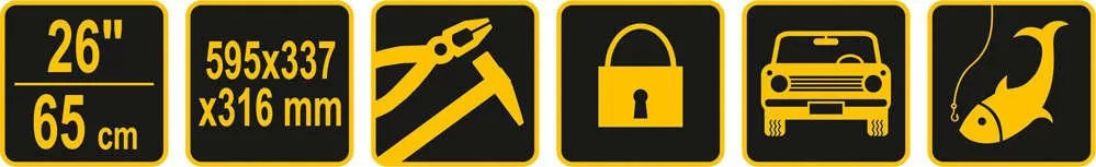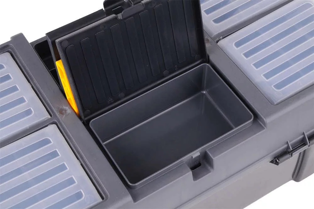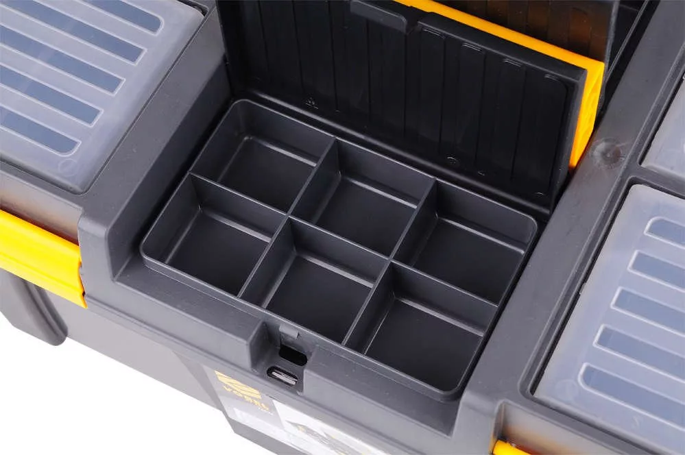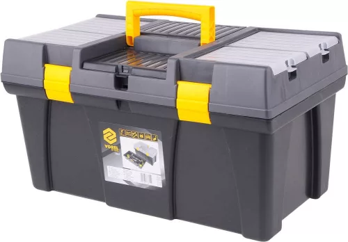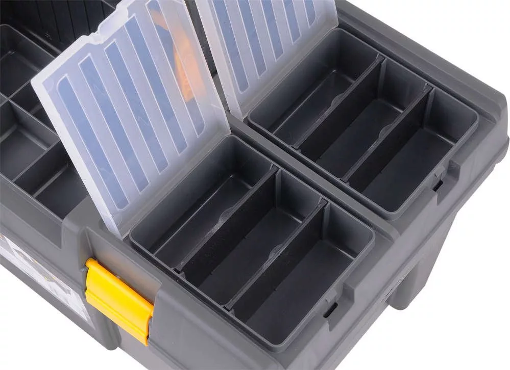 595x337x316 mm-es szerszámosláda kihúzható tálcával, bit-tartóval és további szervezőkkel az apróságok tárolására. A doboz speciálisan kialakított oldalsó fogantyúkkal rendelkezik a könnyű hordozás érdekében.