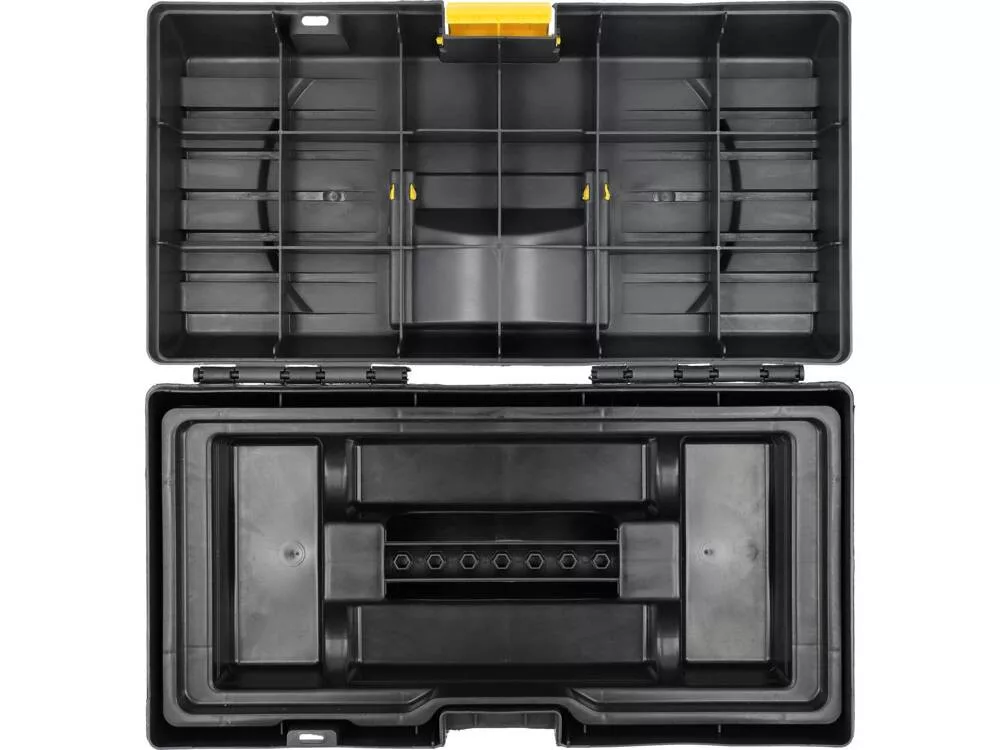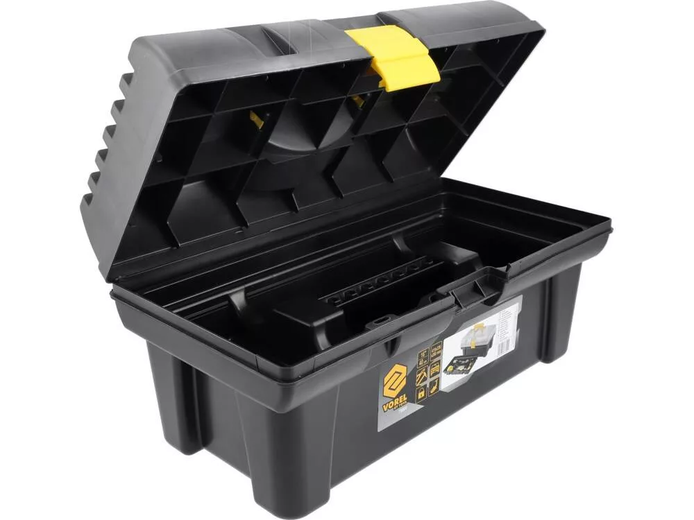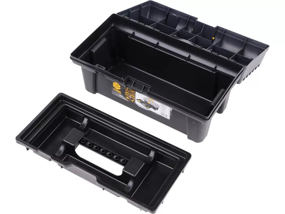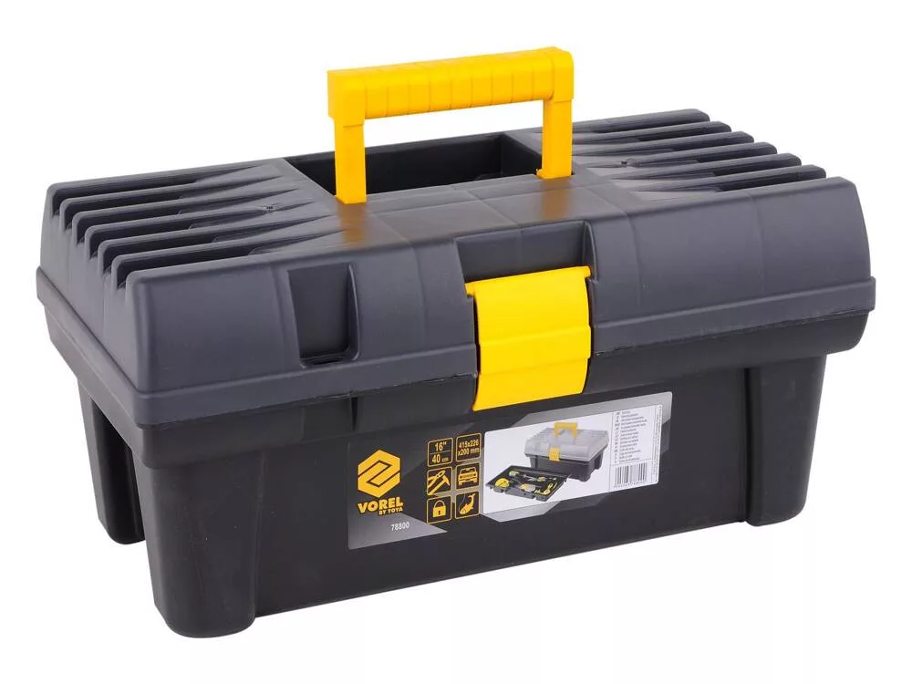 415x226x200 mm-es szerszámosláda kihúzható tálcával és bit-tartóval. Műanyagból készült. A doboz speciálisan kialakított oldalsó fogantyúkkal rendelkezik a könnyű hordozás érdekében. Lakattal zárható.
