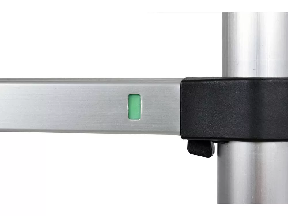 Ezenkívül a felső peremtől 1 m-re egy figyelmeztető lépcsősorral rendelkezik, amely jelzi a maximális biztonságos munkamagasságot. A csúszásmentes lépcsősorok pedig speciálisan hullámosított felülettel rendelkeznek, csökkentve a lábak megcsúszásának és leesésének kockázatát. Ezenkívül a létra öntött csúszásgátló gumilábakkal rendelkezik, amelyek jó tapadást biztosítanak a talajon, és megvédik a karcolásoktól.
