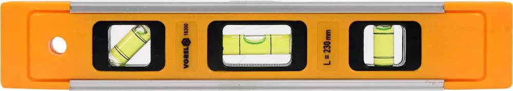 Vízmérték egyszerű mérési munkákhoz. Mechanikai sérüléseknek ellenálló test, ABS műanyag. 3 fiolával rendelkezik - 0˚, 90˚ és 45˚. Mágneses talppal ellátott.