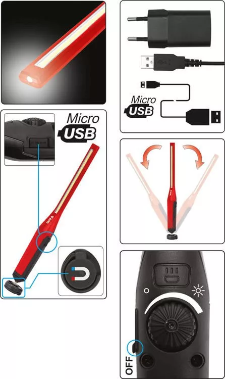 Akkus LED lámpa 7 W+3 W, 2 fényforrással, a 360°-ban elforgatható, mágneses alapra szerelt test lehetővé teszi a lámpa helyzetének szabad beállítását, precízen irányított fénysugárral.