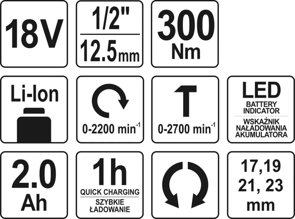 Tartalmazza: ütvecsavarkulcs, 17, 19, 21 és 23 mm-es dugókulcsok, 18 V 2 Ah Li-Ion akkumulátor, gyorstöltő (1 óra 2 Ah-s akkumulátorokhoz),bőrönd.