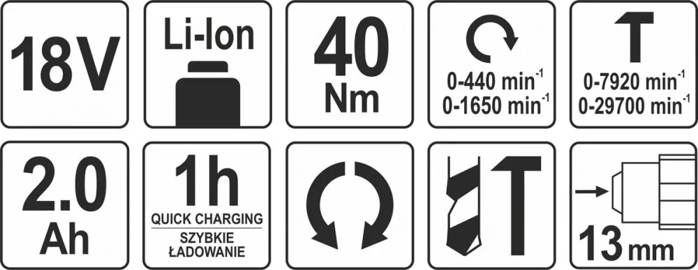 Yato akkus ütvefúró-csavarozó 40 Nm 18 V Li-Ion (1 x 2,0 Ah akku + töltő)