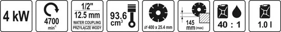 Rendkívül nagy teljesítményű kétütemű vágógép beton száraz és nedves vágásához, valamint - a megfelelő típusú késsel - aszfalt, kő és acél vágásához.
