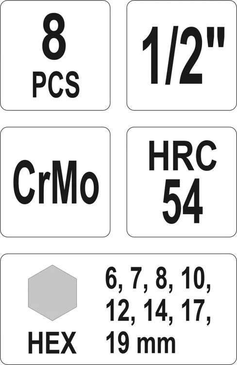 1/2" gépi dugókulcs méretek: 6,7,8,10,12,14,17,19 mm