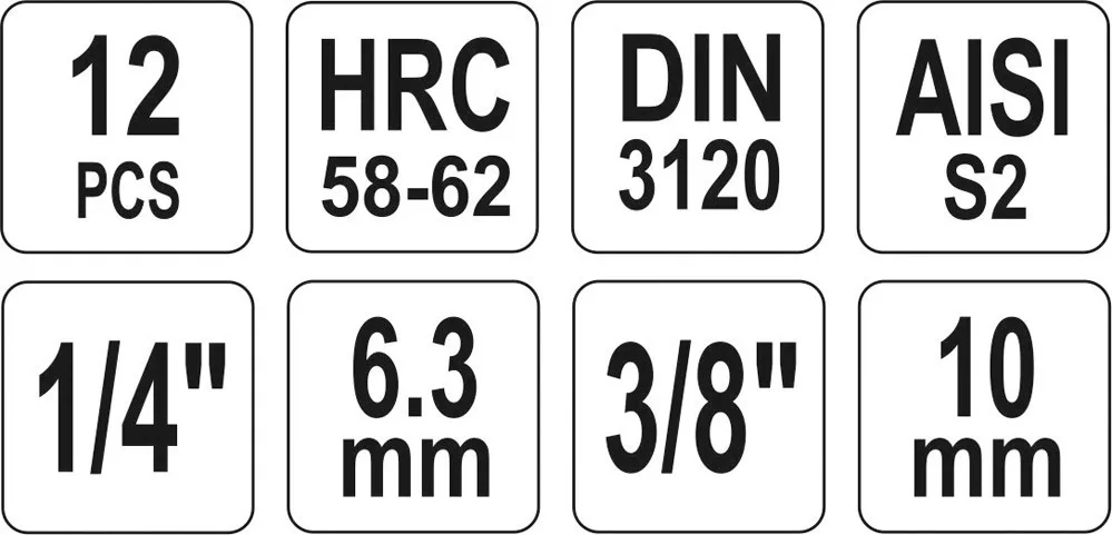 3/8” (9,5 mm): T40, T45, T47, T50, T55 (hossz 48 mm)