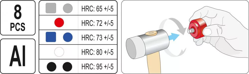 A kalapácsfej alumínium alapú ötvözetből készül, rögzítve egy 320 mm hosszú fanyélre. A készlet 42,5 mm átmérőjű és négyzet alakú 43 x 43 mm kör alakú fejeket tartalmaz.