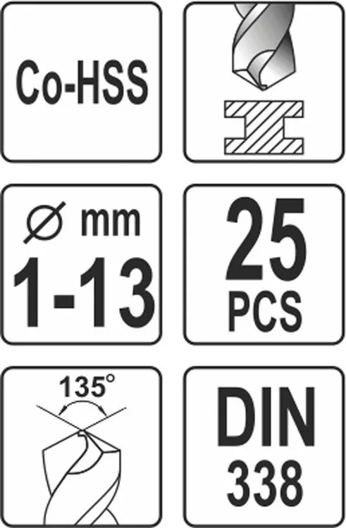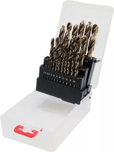 A készlet 25 db fúrót tartalmaz, amelyek átmérője [mm]: 1; 1,5; 2; 2,5; 3; 3,5; 4; 4,5; 5; 5,5; 6; 6,5; 7; 7,5; 8; 8,5; 9; 9,5; 10; 10,5; 11; 11,5; 12; 12,5; 13 - ipar - precíz fúráshoz nehéz anyagokban, például rozsdamentes acélban, színesfémekben, műanyagokban, Doboz fúróméretek jelölésével. Fúrók 25 db.