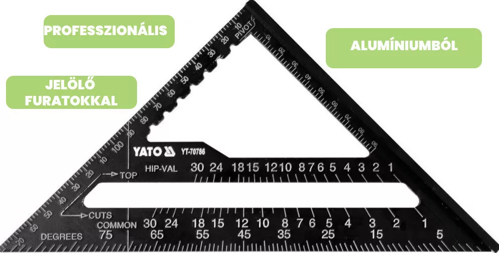 Alkalmazás: ács-, ács- és tetőfedő munkákban lineáris mérésekhez és szögek meghatározásához