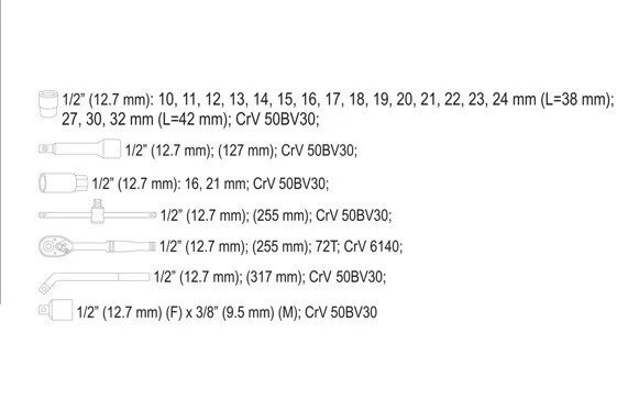 Dugókulcs készlet 25 részes 1/2" 10-32 mm-es, melyet speciális autóipari és mechanikai szolgáltatások igényeinek kielégítésére fejlesztettek ki.