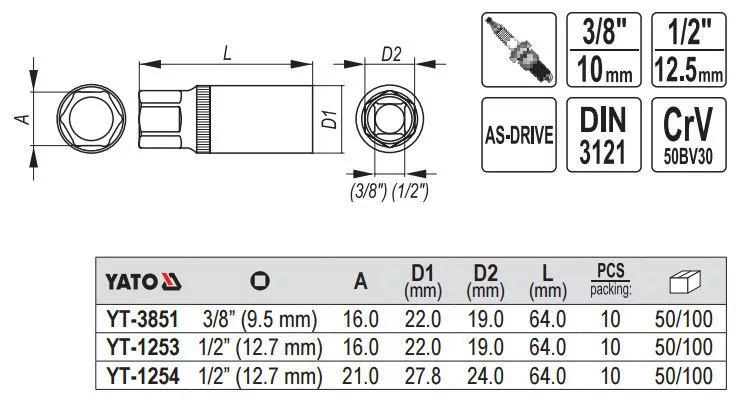 Yato gyertyakulcs 3/8" 16 mm / 64 mm CrV