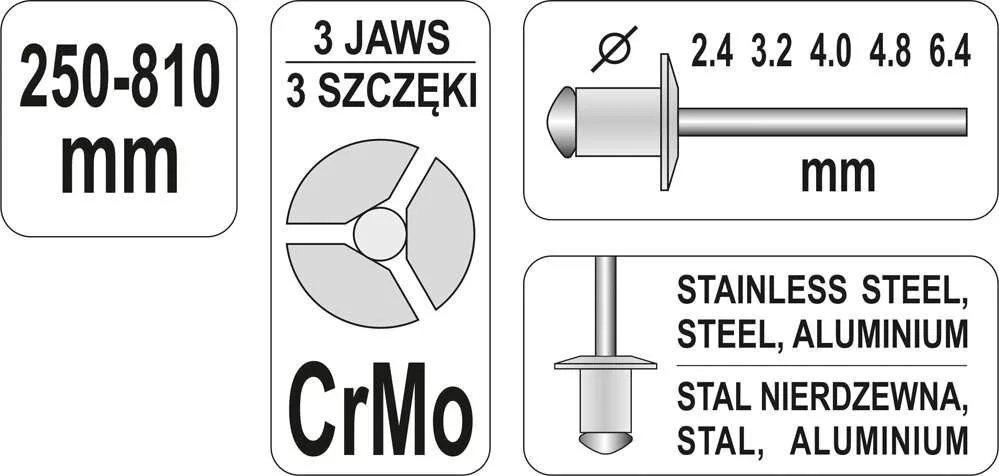 Yato harmónikás popszegecsfogó 250-810 mm (2,4-6,4 mm)