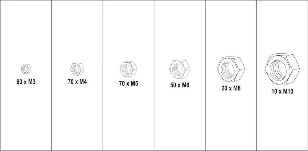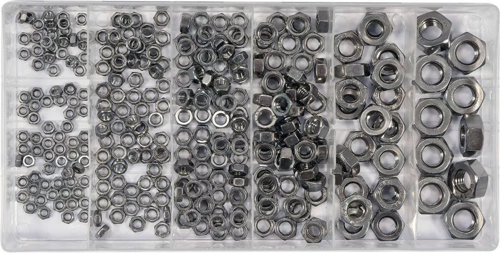 A 300 darabos rozsdamentes acél anyát tartalmazó készlet M3, M4, M5, M6, M8, M10 méreteket tartalmaz.