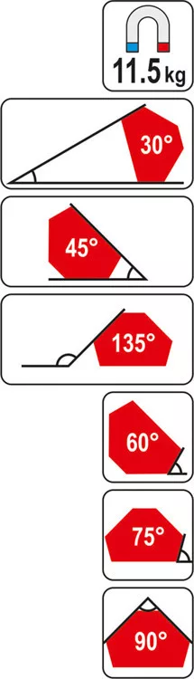 Hegesztőmágnes acéllemezből és erős ferrit mágnesekből. Lehetővé teszi az anyagok pontos összekapcsolását a következő szögekben: 30°, 45°, 60°, 75°, 90° és 135°.