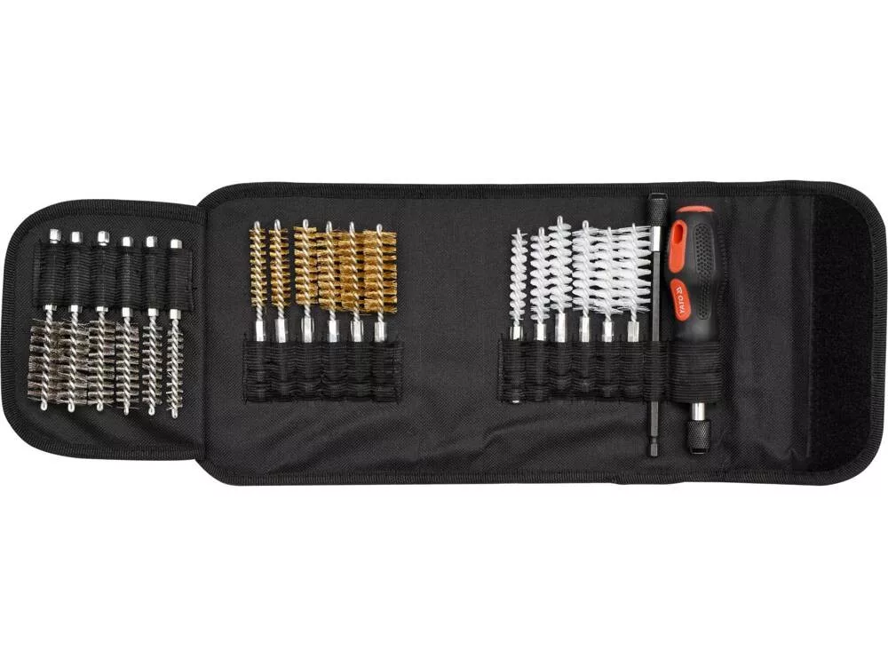 Tartalom: rozsdamentes acél kefe x6, sárgaréz kefe x6, nylon kefe x6, hosszabbító (150 mm), csavarhúzó nyél (150 mm)