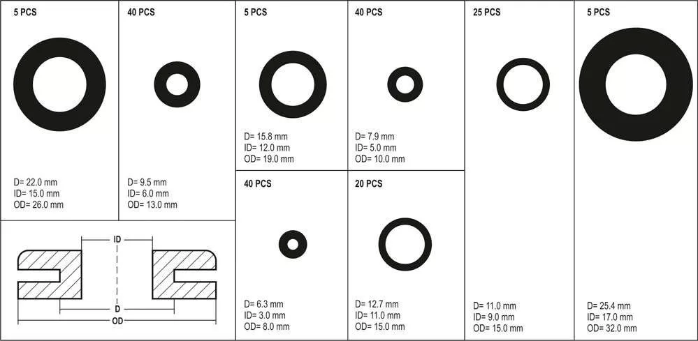 Gumi tömítőgyűrűk x180 (6,3x3x8 mm x40, 7,9x5x10 mm x40, 9,5x6x13 mm x40, 11x9x15 mm x25, 12,7x11x15 mm x20, 15,8x12x19 mm x5, 25x19 mm x5, 27x19 mm x5, 25 x 25 mm x40, 26 x 25 mm x40).