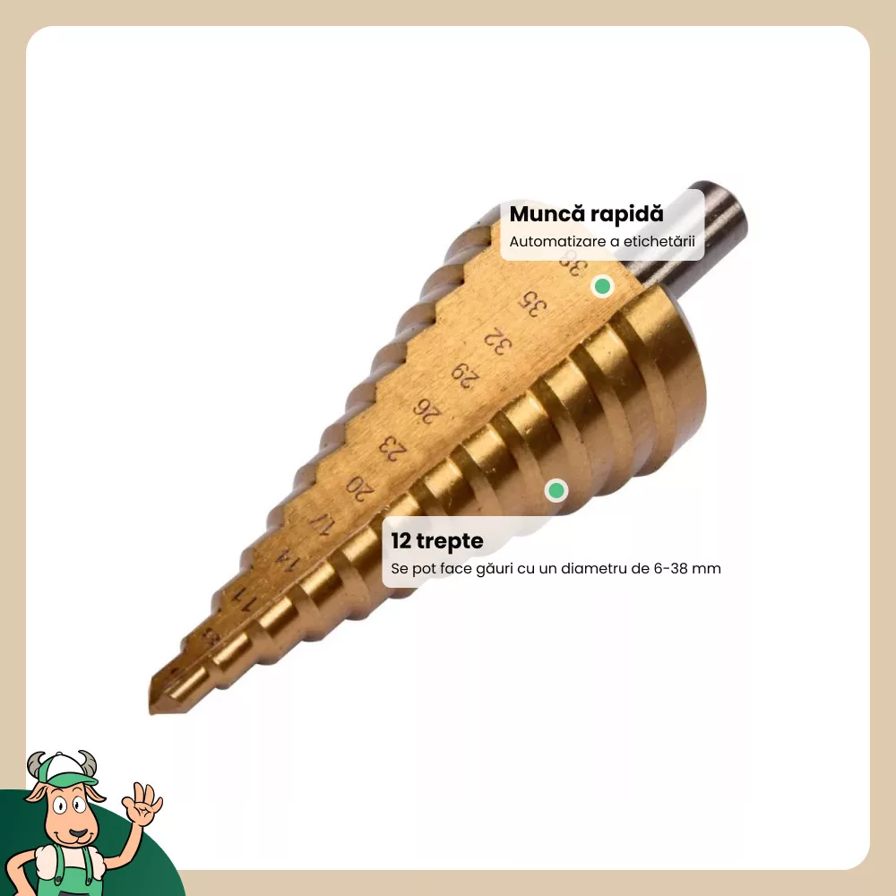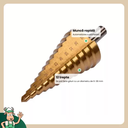 Lépcsős fúró 6-38 mm-es, 12 lépcsős, HSS 4241 gyorsacélból, titán-nitriddel bevonva a fúró tartósságának növelése érdekében, ideális szerszám lemez megmunkálásához.