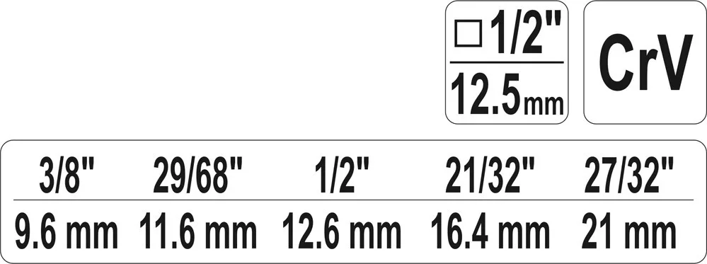 Méret: 3/8" (9,6 mm), 29/68" (11,6 mm), 1/2" (12,6 mm), 21/32" (16,4 mm), 27/32" (21,0 mm)