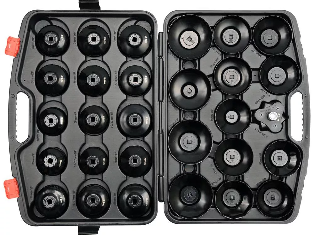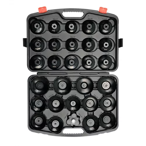 Olajszűrő leszedő készlet 30 részes 3/8", személygépkocsik és kisteherautók fém olajszűrőinek kicsavarására használható.