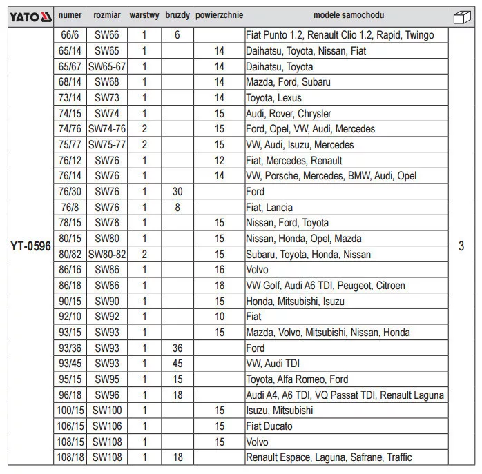 Méretek: SW66, SW65, SW65-67, SW68, SW73, SW74, SW74-76, SW75-77, SW76x4, SW78, SW80, SW80-82, SW86x2, SW90, SW92, SW93x3, SW95, SW96, SW100, SW106, SW108x2.