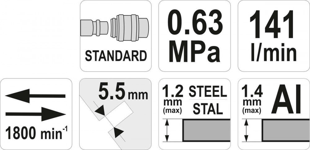 Pneumatikus lemezvágó, lehetővé teszi 1,2 mm és 1,4 mm vastag acéllemezek vágását.